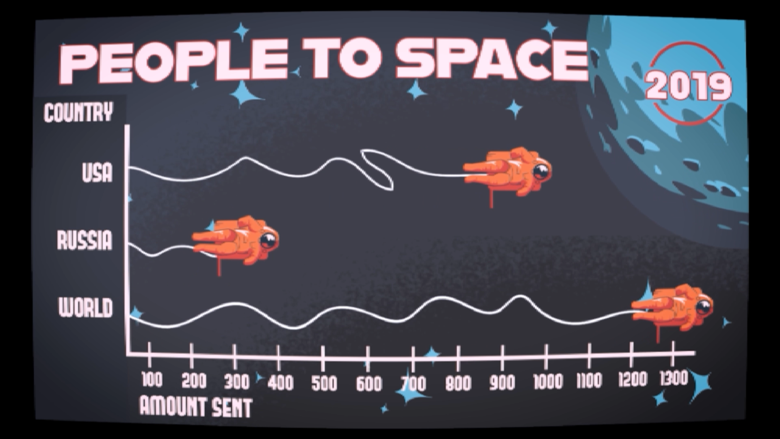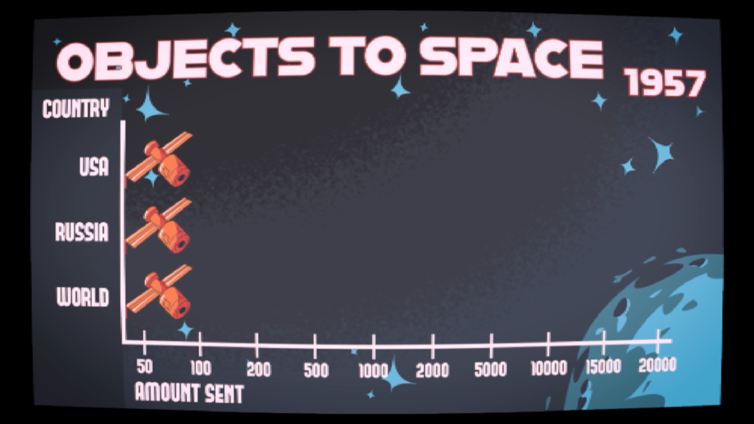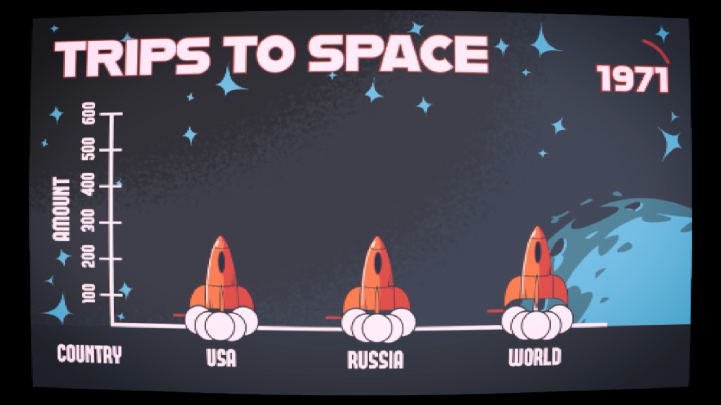 A short, educational motion graphic comparing the process of space travel between the US and Russia as well as the rest of the world including the two superpowers. Stylized like an old CRT TV, the video translates otherwise boring, raw data into aesthetic content.