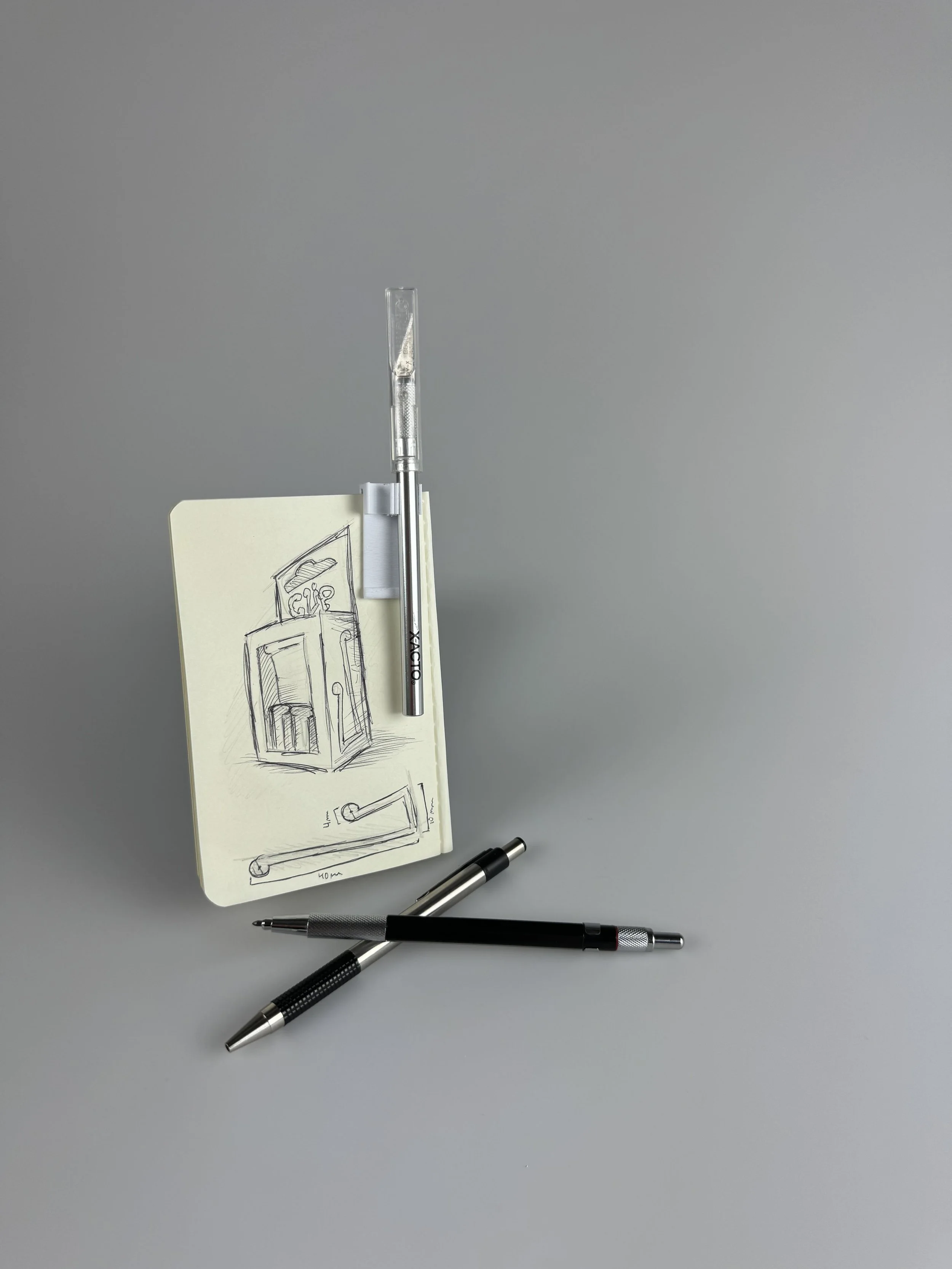 A product and packaging design project focused on identifying an issue, ameliorating it with a product, and effectively marketing it to its target audience. Clip is a small 3-D printed clasp designed to hold a sketchbook open and hold the users pens while they write.